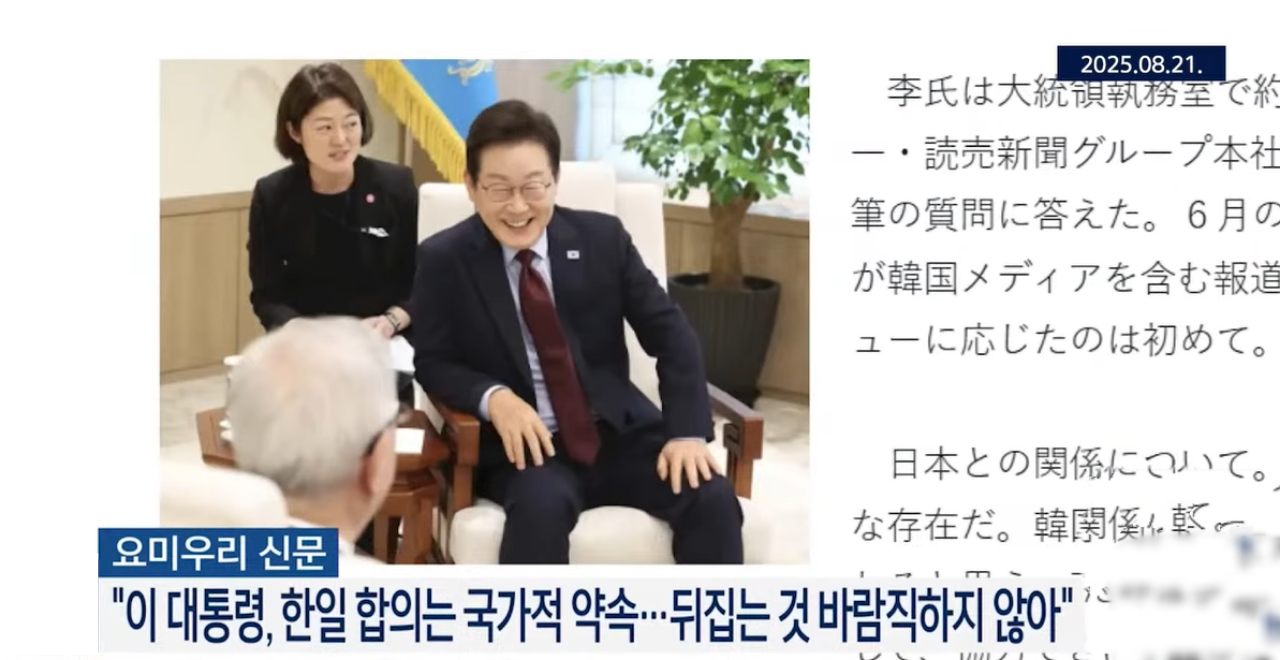 "한국의 이재명 대통령은 19일 오후 서울 청와대에서 요미우리신문과의 단독 인터뷰에 응했다. 한일 현안인 위안부·전 징용공(옛 한반도 출신 노동자) 소송 문제를 놓고 한국의 과거 정권이 일본과 맺은 합의에 대해 '뒤집는 것은 바람직하지 않다'며 답습할 뜻을 강조했다."
