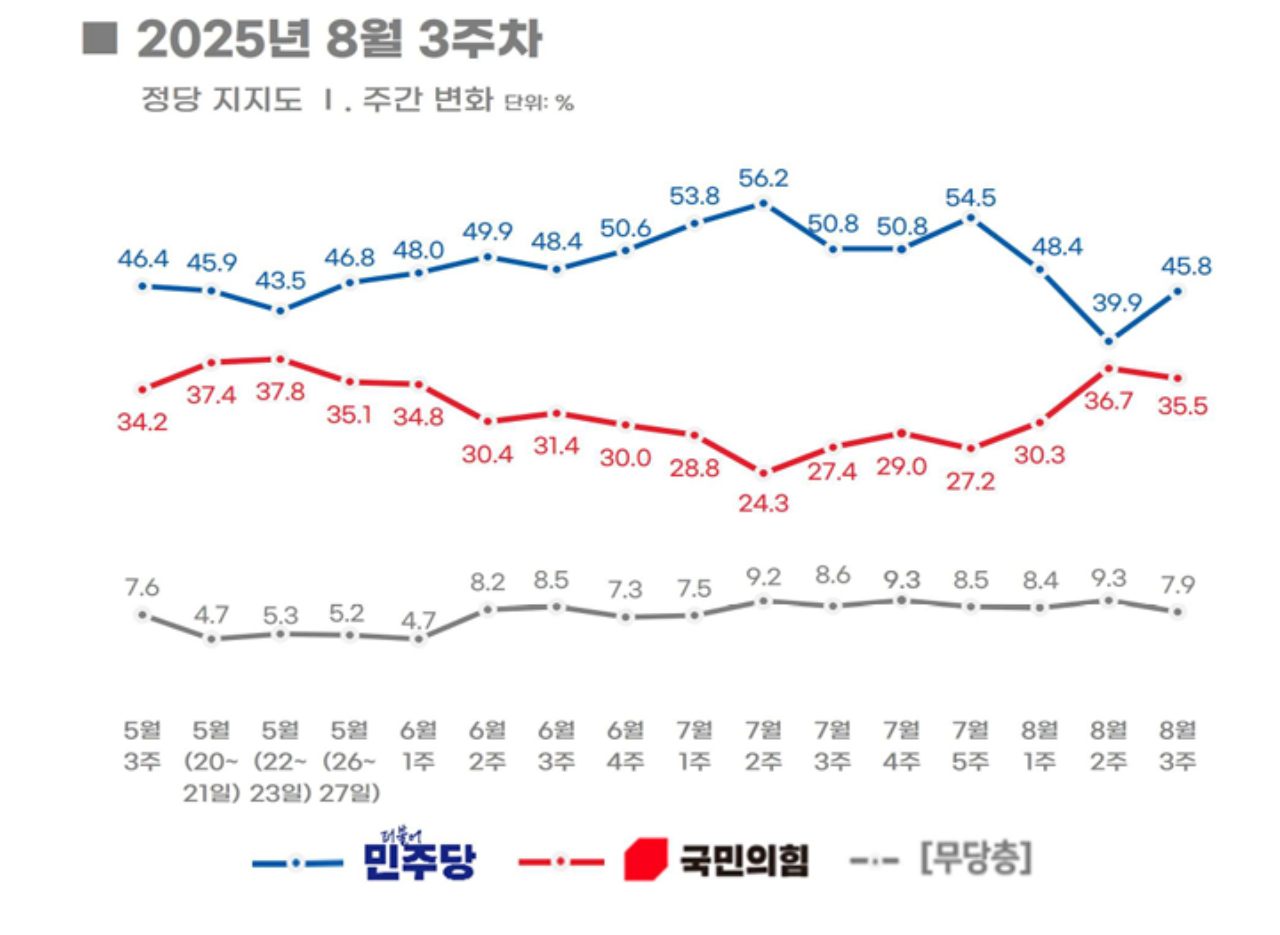 ▲민주당 지지율은 45.8%를 기록하며 전주 대비 5.9% 상승해 40%대를 회복했다. 8월 1주차 48.4%에서 2주차 39.9%로 떨어지며 30%대까지 무너지더니 다시 올랐다. 반면 ▲국민의힘은 35.5%로 지난주보다 1.2%p 하락했다. 1주차 30.3%에서 2주차 36.7%까지 올라 민주당과 오차범위 내 접전 양상을 보이다가 양당 간 격차는 10.3%p로 다시 오차범위 밖으로 벌어졌다. ▲조국혁신당은 3.2%로 지난주 5.7%에서 2.5%p ▲개혁신당은 4.4%에서 3.4%로 1%p 떨어졌다. ▲진보당은 1.5%로 전주보다 0.6% 올랐다.