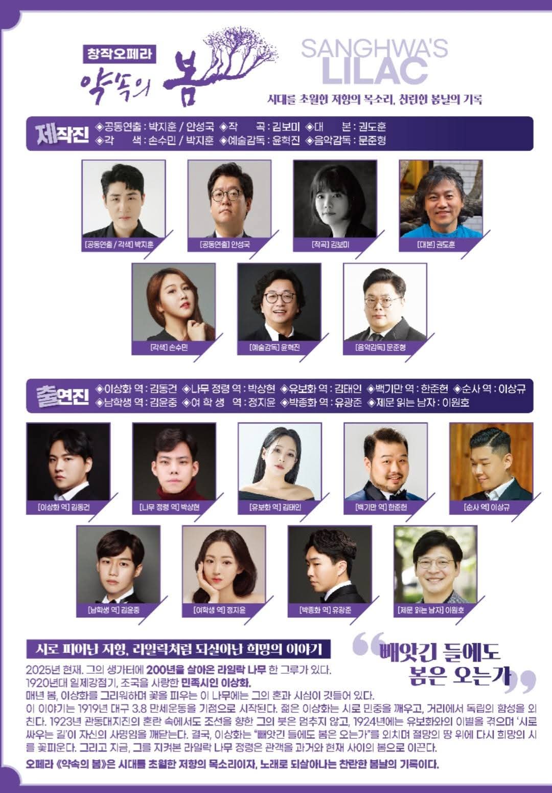 '약속의 봄' 창작오페라 웹포스터 / 사진.라일락뜨락1956 저작권자 © 평화뉴스 무단전재 및 재배포 금지 * 가치를 생각하는 대안언론, 평화뉴스 후원인이 되어 주세요. <후원 안내> 개의 댓글 회원로그인 작성자 비밀번호 댓글 내용입력 댓글 정렬 최신순 추천순 답글순 BEST댓글 BEST 댓글 답글과 추천수를 합산하여 자동으로 노출됩니다. 닫기 더보기 댓글삭제 삭제한 댓글은 다시 복구할 수 없습니다. 그래도 삭제하시겠습니까? 비밀번호 닫기 댓글수정 댓글 수정은 작성 후 1분내에만 가능합니다. 본문 / 400 비밀번호 닫기 내 댓글 모음 닫기 당신이 좋아할 만한 기사 '전태일' 대구 옛집에 모인 노동자들, 밥 한끼 나누며 "노동이 존중 받는 사회되길" 거리로 나온 대구 7개 구청 공무직 노동자들..."저임금 심각, 처우개선" 촉구 대구지하철 1·2호선 오늘 하루 파업...노조 "현장 인력 부족, 충원" 촉구 헌재, 광역의회 선거구 획정 '위헌'...정의당 "대구시의회 30석→41석 증원해야" '단속' 피하다 숨진 이주노동자 뚜안을 기리며...대구 동성로 "진상규명" 촛불 정청래, '인혁당' 거론하며 사법부 비판...허소 "30년 쇠퇴, 대구 부활 이끌 것" '평균 나이' 80세 김천 증산초...어르신 학생 배제한 '통폐합 추진' 논란 대구시, 고장난 '범어네거리 전광판' 1년째 방치...결국 내년에 '철거' 내년 지방선거, "여당 다수 당선" 42% vs "야당" 35%...TK 민주·국힘 좁혀지고 '지선 기대'는 격차 커져 쉴 곳 없는 청소노동자들...대구 8개 구.군 '휴게시설' 미설치, 수성구 1곳만 운영 '30년 난제' 대구 취수원, 구미→안동댐→제3안...행감 "이전 의지 있나" 쓴소리 포항제철소, 노동자 6명 '가스흡입' 3명은 심정지...보름만에 또 '산재사고' 지금 주목 받고 있어요 "행정감사, 비판만 하지 말고...더 나은 해법도 같이 제안했으면" 대구 북구청, 수달도 안사는 '수달 보금자리'에 3억..."흉물" 민원만 헌재, 광역의회 선거구 획정 '위헌'...정의당 "대구시의회 30석→41석 증원해야" 대구지하철 1·2호선 오늘 하루 파업...노조 "현장 인력 부족, 충원" 촉구 내년 지선 "여당" 42% vs "야당" 35%...TK 민주·국힘 좁혀져 '미준공' 동대구역 광장의 박정희 동상...철도공단 "법 위반", 대구시 "실효적 이용" 설전 포항제철소, 노동자 6명 '가스흡입' 3명은 심정지...보름만에 또 '산재사고' 대구 북구의회, 발달장애인 사회활동 부담 덜어주는 '보험지원' 조례 제정 '평균 나이' 80세 김천 증산초...어르신 학생 배제한 '통폐합 추진' 논란 정청래, '인혁당' 거론하며 사법부 비판...허소 "30년 쇠퇴, 대구 부활 이끌 것" 대구시교육청은 교육(상담)복지사 '소멸 직종' 규정 철회하고, 전국 152명의 학계 성명서와 시민사회의 요구에 응답하라! 배광식 대구 북구청장 '채용비리' 의혹...북구의회 책임 공방, 공무원은 해명 '진땀' 포스코, 10년간 하청노동자 50명 산재 사망..."죽음의 외주화 심각, 정부 뭐하나" "행정감사, 비판만 하지 말고...더 나은 해법도 같이 제안했으면"
