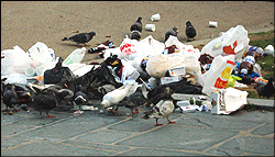 검은 1리터 비닐봉지가 배를 불뚝 내어놓고 여기 저기 우뚝 서 있다. 비둘기는 아직 검은 배 속으로 삼켜지지 않은 쓰레기들을 열심히 파헤치며 음식 찌꺼기를 먹으며 쓰레기를 여기저기 흩어 놓는다. 미화원의 적은 비둘기?