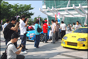 전시장 입장을 포기한 사람들도 건물 앞 광장과 전시장 입구 홀에 전시된 슈퍼카와 사람 구경으로 여념이 없다.