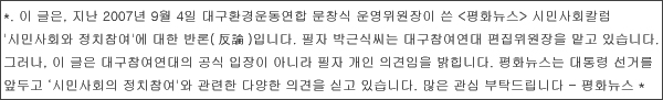 시민운동의 정치참여를 주장하는 내용을 거칠게 정리하자면, 시민운동이 본질적으로 정치적인 것이고, 더불어 정치적 중립성은 애초부터 존재하지 않으며, 대선공간의 중요성과 역동성에 주목해 후보 전술에 적극 참여해야 하고, 나아가 정치활동은 애당초 개인의 판단의 문제이므로 개인에게 맡겨야 된다는 것이다. 미루어 짐작하자면, 시민운동 자체로서는 분명한 한계가 있으므로 정당운동과의 적절한 결합을 통해서 서로 윈-윈 하자는 전제에서 출발한 것 일게다. 공감하는바 적지 않다. 그러나 그 반대에 있는 사람으로서는 다소 억울한 것도 있다. 아마도 자세한 설명의 부족에서 기인하는 바라 생각한다. 부족하지만 반론을 제기한다.