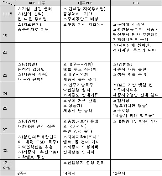"세종시 논란의 최대 피해 지역이 될 것이라는 전망이 현실이 되고 있지만 단체장과 지역 정치권은 말이 없습니다." (대구MBC 11.18)