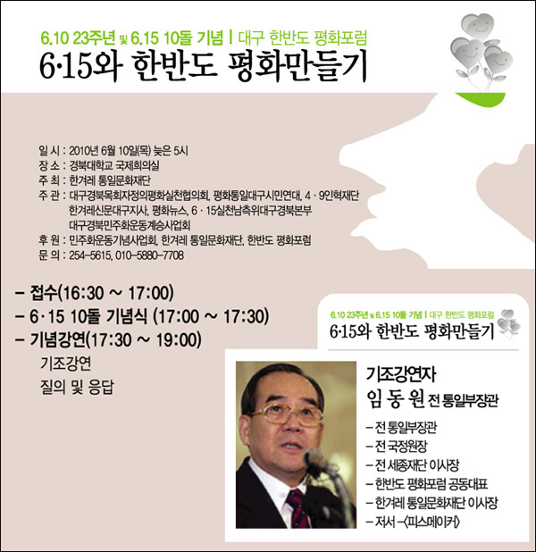 임 전 장관의 강연은 6월 10일 오후 5시 경북대학교 국제회의실에서 '6.15와 한반도 평화만들기'라는 주제로 열린다. 임동원 전 장관은 '국민의 정부' 당시 두 차례에 걸쳐 통일부장관(1999/2001)과 대통령 외교안보통일특별보좌역(2001-2003), 국가정보원장(1999-2001)을 맡아 6.15남북공동선언과 대북 관계의 핵심적 역할을 했다. 지금은 '한반도평화포럼' 공동대표와 '한겨레 통일문화재단' 이사장을 맡고 있다.