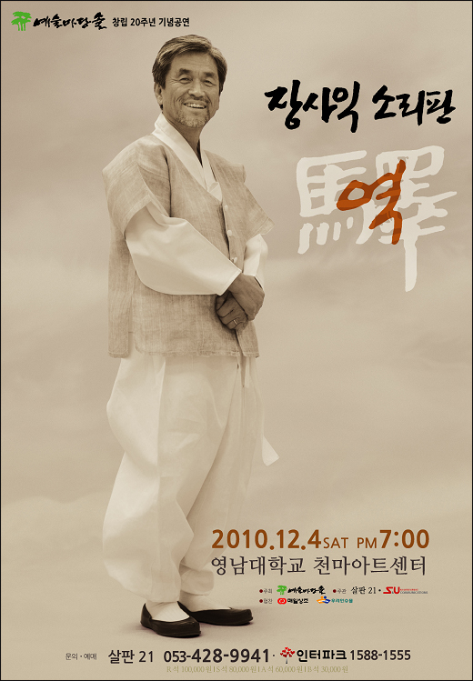 장사익 공연은 12월 4일 저녁 7시 영남대 천마아트센터에서 열린다. '역(驛)'이라는 주제로 열리는 이 공연은 '찔레꽃'을 비롯해 장사익 특유의 감성으로 재해석한 노래들을 선보인다. 특히, 여행, 역, 산너머 저쪽, 기형도 시인의 엄마 걱정, 이게 아닌데, 허허 바다 등의 작은 주제별로 1,2,3부를 나눠 소리꾼 장사익의 진수로 초겨울 밤을 수 놓는다. 공연장 1889석 가운데 잘 보이지 않는 사석을 뺀 1700석의 좌석 티켓을 3만원에서 10만대에 팔고 있다. "다 팔아야 새 공간을 마련하는데...예전같이 않아 걱정"이라고 했다.
