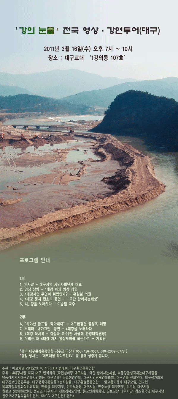 그래서 ‘강의 눈물, 전국 영상․강연투어’의 이 의미있는 도전을 환영받을 만하다 할 것입니다. 부디 이들의 투어가 전국적으로 성황을 이루면서 오로지 속도전으로만 치닫고 있는 이 죽음의 사업에 강력한 ‘제동 드라이브’를 걸 수 있는 계기가 되길 바랍니다.