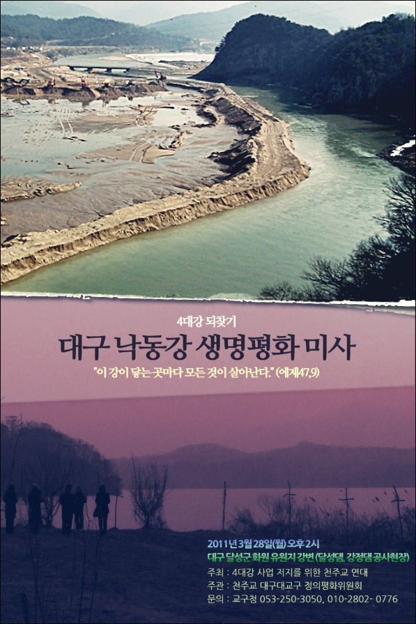 '4대강 사업 저지를 위한 천주교연대'는 3월 28일 오후 2시 대구시 달성군 화원유원지 강변 주차장에서 '4대강 되찾기 2011년 천주교연대 전국미사'를 봉헌한다. '천주교 대구대교구 정의평화위원회'(위원장 김영호 신부)가 주관하는 이 미사는, 대구대교구 허연구.원유술 신부를 비롯해 전국의 사제 30여명의 공동집전하고 신자와 시민단체 회원 600-700여명이 참가할 것으로 주최측은 예상하고 있다.
