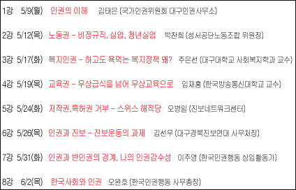 ▶'인권의 이해'(5.9 김태은)를 시작으로 ▶'노동권 - 비정규직, 실업, 청년실업'(5.12 박찬희), ▶'복지인권-하고도 욕먹는 복지정책 왜?(5.17 주은선), ▶'교육권-무상급식을 넘어 무상교육으로'(5.19 임재홍), ▶'저작권.특허권 거부-스위스 해적당'(5.24 오병일), ▶'인권과 진보-진보운동의 과제'(5.26 김선우), ▶'인권과 반인권의 경계, 나의 인권감수성'(5.31 이주영), ▶'한국사회와 인권'(6.2 오완호) 순으로 모두 8강이 진행된다. 강연은 매주 2회씩, 저녁 7시부터 대구시청 근처에 있는 한국인권행동 사무실에서 열린다.