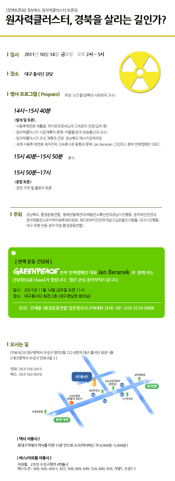 그럼에도 불구하고 경북도는 공론화 또는 지역주민들의 의견을 수렴하는 과정도 생략한 채 일방적인 유치활동을 하고 있습니다. 원전관련 산업의 후보지가 되는 해당 지역 주민은 물론 대부분의 경북 주민들은 사업의 내용도 모르는 상태에 있습니다. 이에 환경운동연합과 동해안 일대 주민대책위에서는 경상북도와 함께 원자력클러스터 사업에 대한 찬반 양측 전문가를 모시고 공개적인 토론회를 합니다. 이 토론회가 원자력클러스터 사업에 대한 지역사회의 다양한 의견을 청취하고 여론을 수렴하는 자리가 되리라 기대합니다. 많은 관심과 적극적 참여를 당부 드립니다.