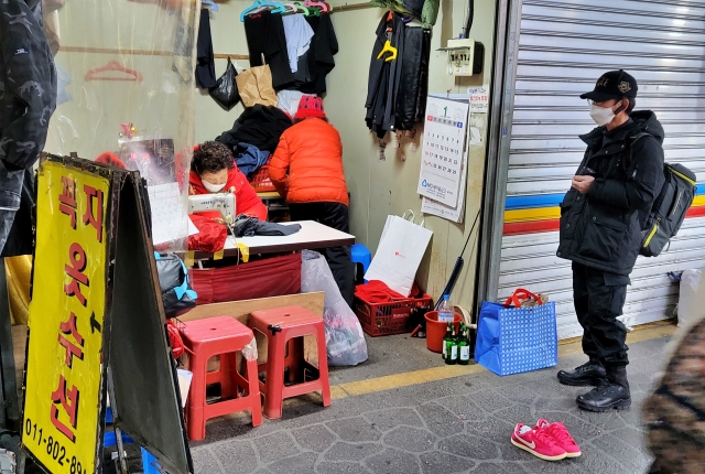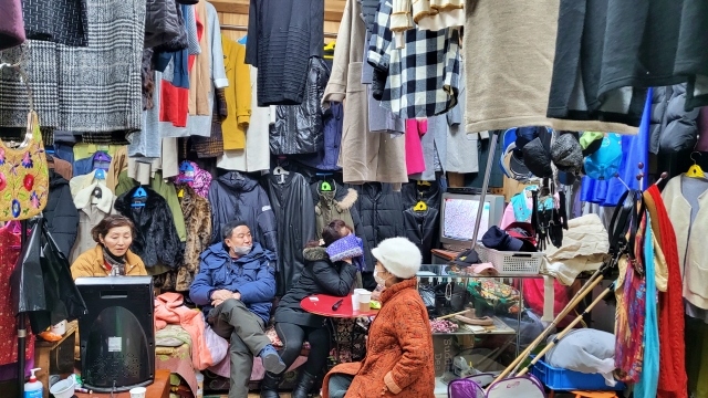 ▲ 대구 남구 관문시장 구제골목 헌옷가게 사장님들이 이야기 중이.(2022.1.5) / 사진.평화뉴스 김영화 기자