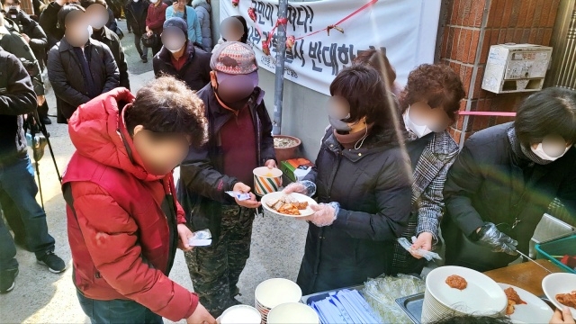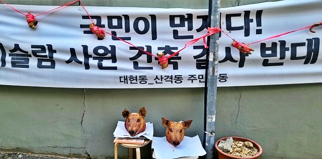 ▲ 대구 북구 대현동 이슬람사원 건축 반대 현수막과 그 아래 돼지머리, 족발들(2023.1.18) / 사진.평화뉴스 김영화 기자