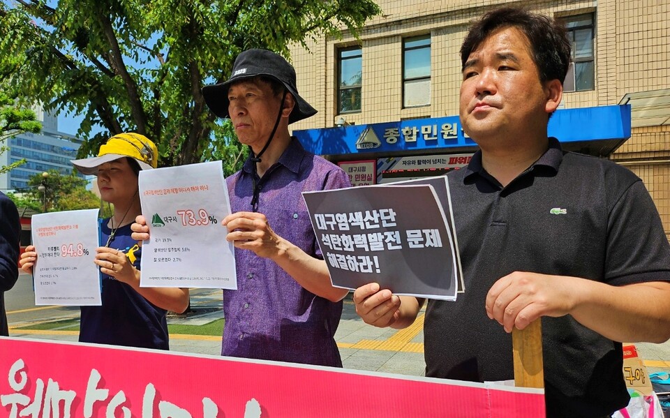 '대구기후위기비상행동'은 24일 오전 대구시청 동인청사 앞에서 기자회견을 열고 "오염된 공기와 악취 더는 안 된다"며 "대구시는 서구 염색산업단지 석탄화력발전 문제를 해결하라"고 촉구했다.