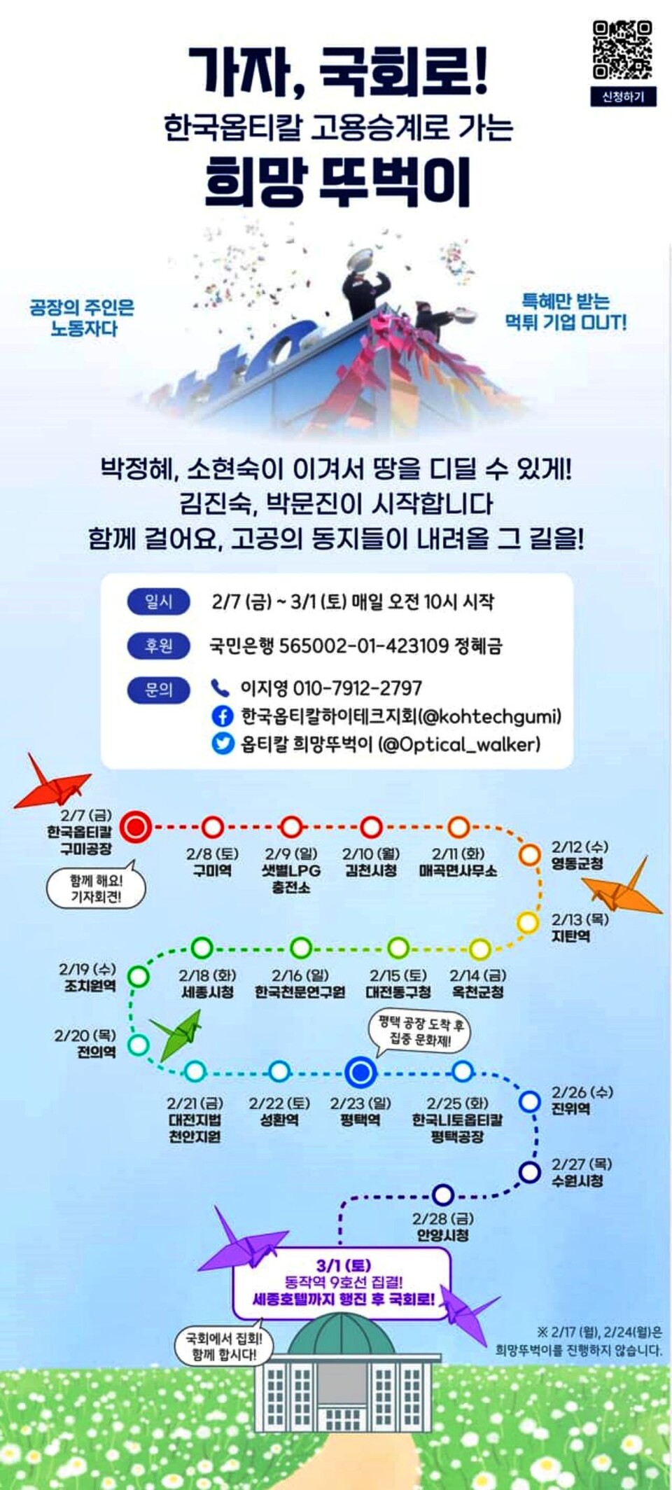 김진숙, 박문진 두 노동자는 오는 2월 7일부터 3월 1일까지 매일 오전 10시부터 행진에 나선다. 한국옵티칼 구미공장에서 기자회견을 열고 첫 행진을 시작한다. 구미역, 김천시청, 매곡면사무소, 지탄역, 옥천군청, 대전동구청, 세종시청, 평택역을 지나 한국니토옵티칼 평택공장을 돈다. 이어 수원시청, 안양시청을 지나 최종 목적지인 서울 여의도 국회까지 걸어 국회 앞에서 집회를 열 예정이다.