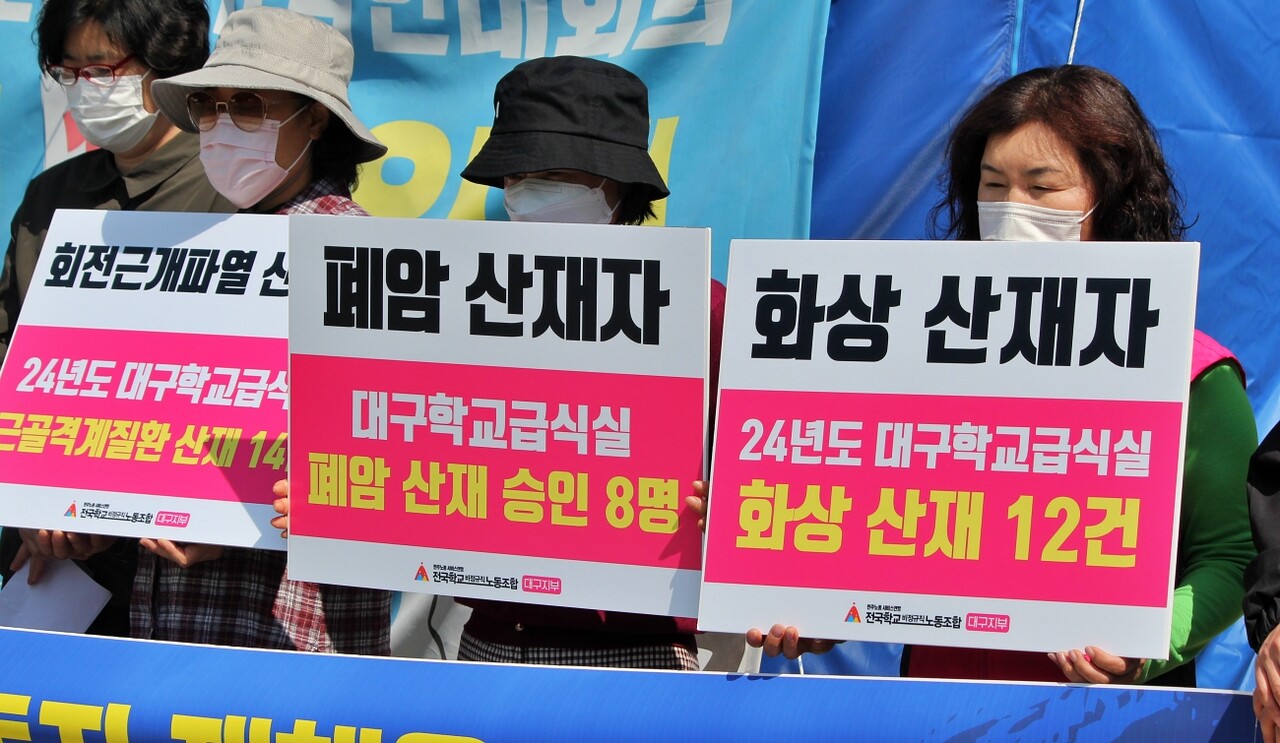 노조는 "학교급식실 노동자들은 폐암뿐만 아니라 만성적인 근골격계 질환과 끊임없는 넘어짐, 화상 사고 등 각종 산재에 노출돼 있다"면서 "이는 노동자가 부족한 현실에서 배식 시간을 맞추기 위해 지나치게 서두르며 일하는 과정에서 발생하는 전형적인 사고와 질병"이라고 주장했다.